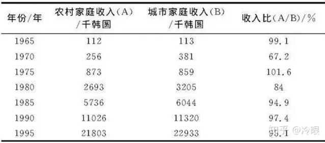 1970年,250万农户中大约有80%住茅草屋,20%的农户通电,连接乡村的道路大多没有修好,5万个自然村中只有60%能通汽车,韩国农村家庭收入与城市家庭的比值达到1965年以来的最低值,如下表: