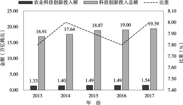 2017年,韩国科技创新投入额占GDP比重为4.55%[18],处于世界领先位置。2013—2017年韩国政府部门用于农业科技创新的资金投入数额稳步上升,2017年农业科技创新投入额达到1.54万亿韩元,比2016年增长3.36%。2013—2017年农业科技创新投入占政府科技创新投入总额的比重在7.8%~8%(图1),投入比例较高。