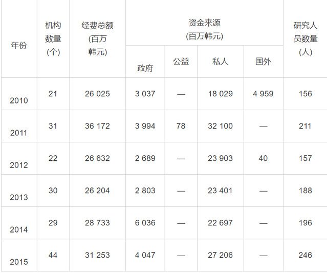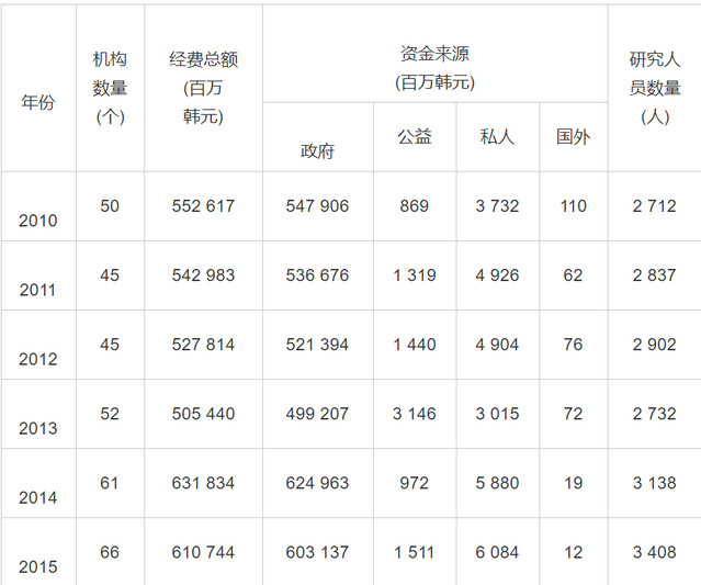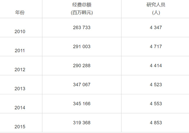 数据来源:http://sts.ntis.go.kr/ntis。表3至表5同。注:韩国国家科技信息服务中心(NTIS)官网数据只更新到2015年。表3至表5同。