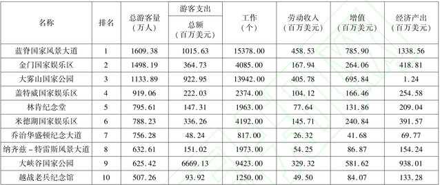 表1美国接待游客量前10的国家公园游客在当地社区的花费及贡献