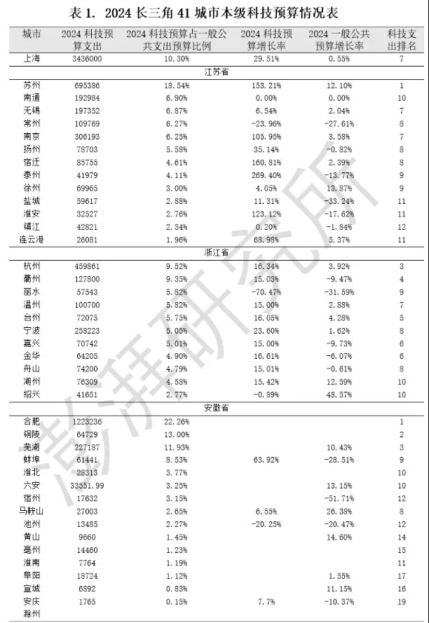 从表1可见,长三角不少中小城市的科技支出占比和增速数据亮眼。比如,安徽省内,2024年铜陵科技预算占比13%排在第2,而该市2023年GDP仅排第8;蚌埠在一般公共预算缩减28.5%的情况下,科技预算同比增长63.92%。