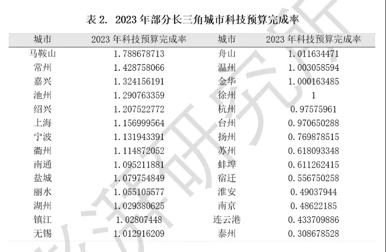 科技预算强度,主要受本地财力、公共服务需求和战略重点等方面的综合影响。当本地财力、公共服务需求和战略重点发生变化,也会体现在科技预算的动态上。为此,研究员统计了部分城市2023年的科技预算完成率(表2),发现个别城市“花超了”,个别城市“没花完”。