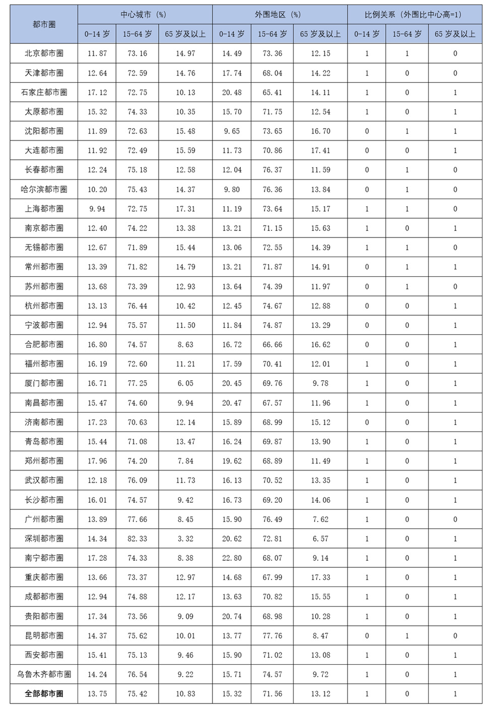 表7 2020年都市圈中心城市与外围地区人口年龄结构对比