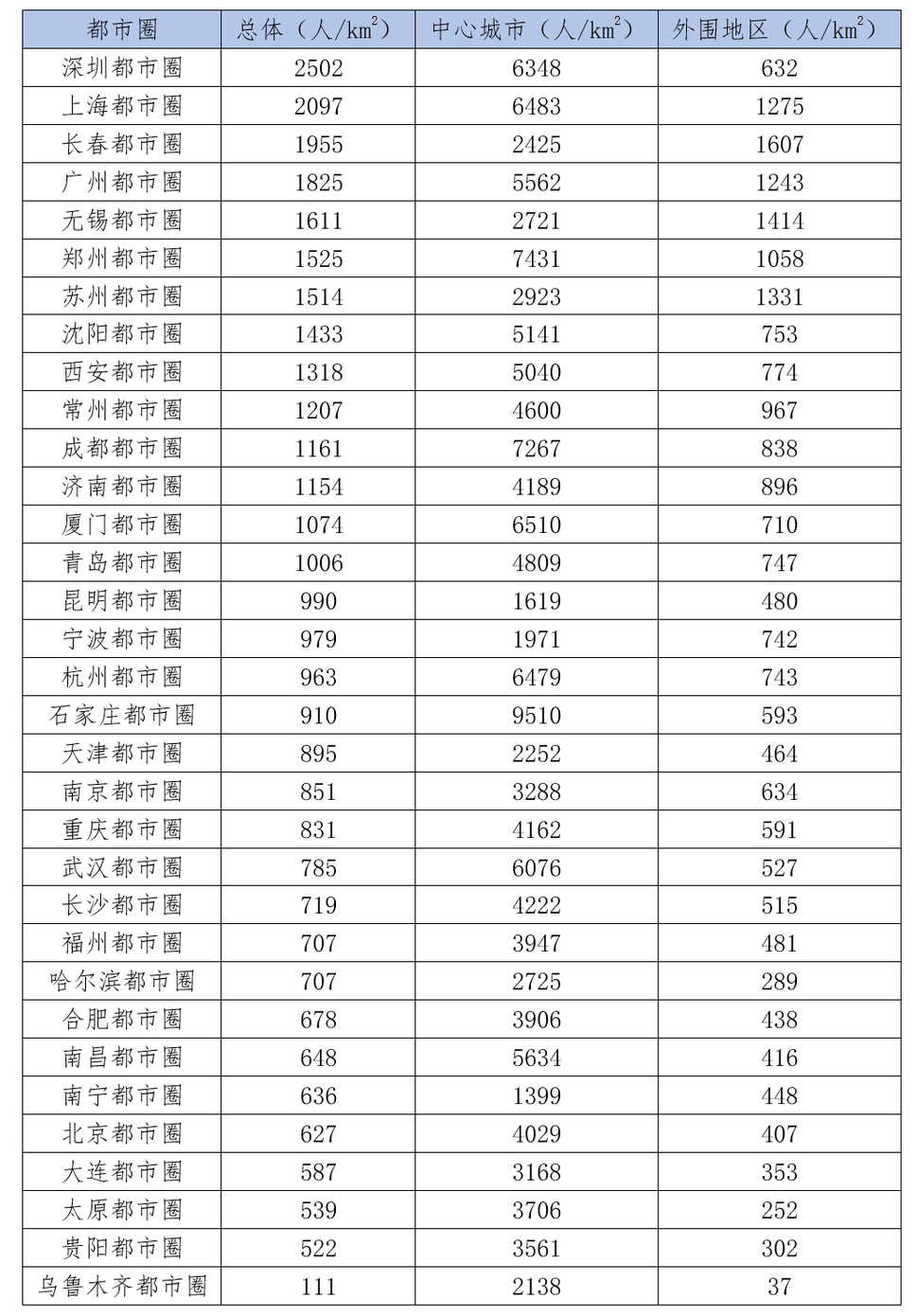 表4 2020年都市圈人口密度(按总体人口密度排序)