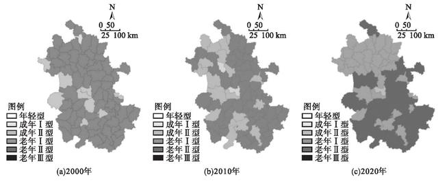 图6.安徽省2000年到2020年老龄化空间变化图片来源:肖铁桥,马瑾美,李融融.安徽省县域人口老龄化时空演变及影响因素研究[J].沈阳建筑大学学报(社会科学版),2023,25(03):271-278.