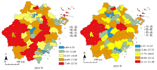 来看各省份情况。2010年,浙江省人口老龄化程度高的区域(红色)分布在浙江西部和中部,而到了2020年,老龄化程度高的区域整体归拢到浙西(主要是衢州市),中间相对高值消失了。
