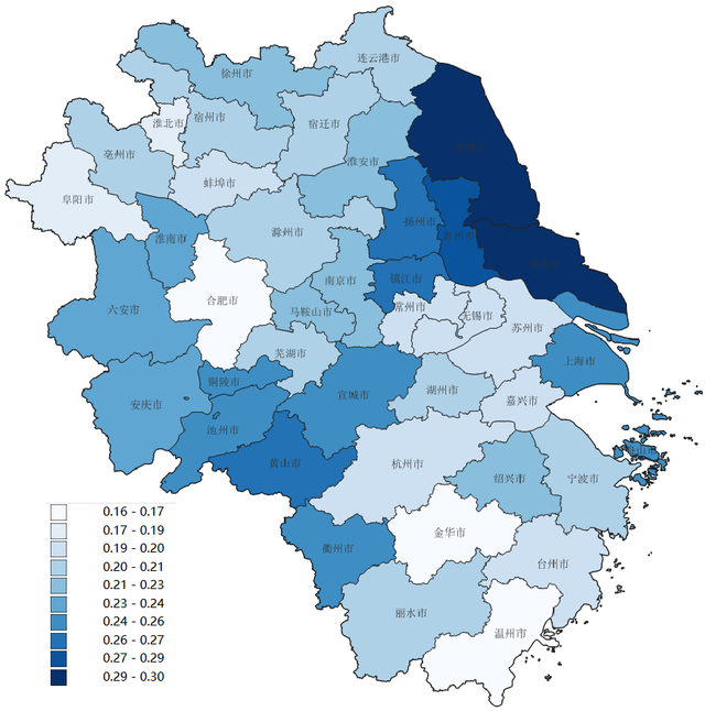 图3. 长三角人口老龄化分布;数据来源本文表3