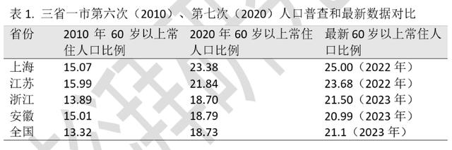 根据各省最新数据,长三角60岁以上常住人口比例在22.8%以上,至少高于全国1.7个百分点[1]。其中上海老龄化水平最高,2023年常住60岁以上人口25%(参考表1),其次是江苏(23.68%),浙江(21.50%)和安徽(20.99%)。江浙沪老龄化水平(22.79%)均超全国均值(21.1%)。
