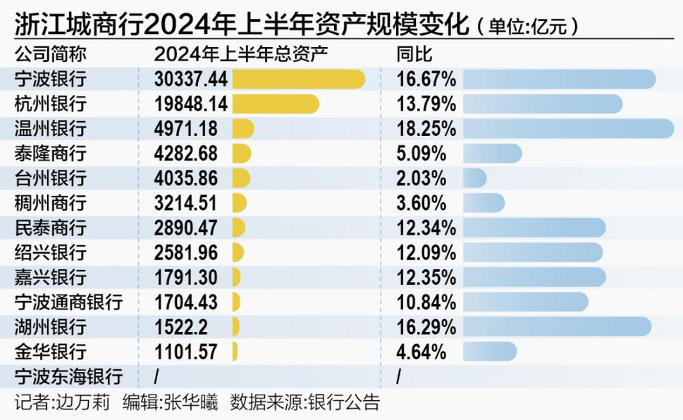 从规模扩张速度看,浙江省内有2/3的城商行保持了两位数增长。其中,温州银行增速最高,由4203.91亿元增长至4971.18亿元,同比增幅达18.25%。宁波银行、湖州银行增速保持在15%以上,同比增速分别增长16.67%、16.29%。