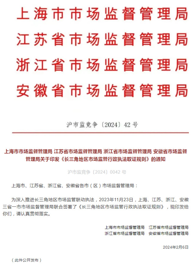中国质量新闻网讯 为进一步规范长三角地区市场监管行政执法取证行为,提升执法效能,持续优化长三角地区营商环境,依据《行政处罚法》《市场监督管理行政处罚程序规定》等法律、法规和规章的有关规定,结合长三角地区三省一市市场监管行政执法实际,上海市市场监管局联合苏浙皖省局制定了《长三角地区市场监管行政执法取证规则》。