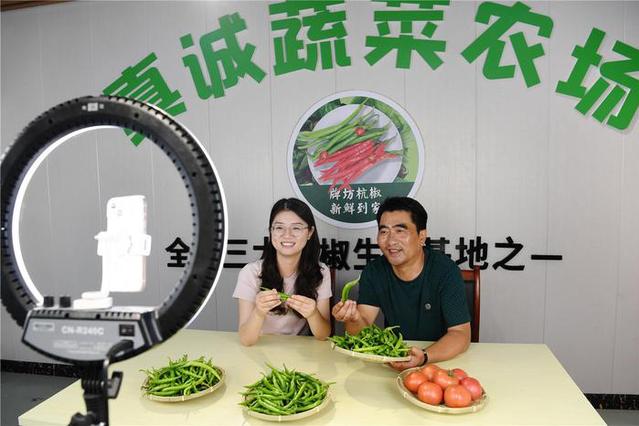 6月2日,在肥东县牌坊乡真诚蔬菜种植专业合作社,主播在直播销售杭椒。目前,该乡杭椒种植面积近万亩(含复种),每年销往沪苏浙地区7500吨,占当地市场份额的七成。本报记者 徐旻昊 摄