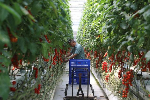 5月31日,在蒙城兴农绿港现代农业科技产业园内,丰收的小番茄早上采摘,经过冷链车运输,当天就能摆在南京、杭州等地超市的货架上。本报记者 李 季 摄