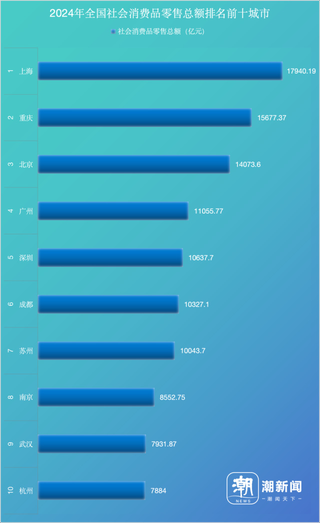 近日,苏州正式“官宣”,2024年实现社会消费品零售总额(下文简称“社消零”)10043.7亿元,成为全国第七个万亿级消费城市,也是首个迈入万亿消费俱乐部的地级市。