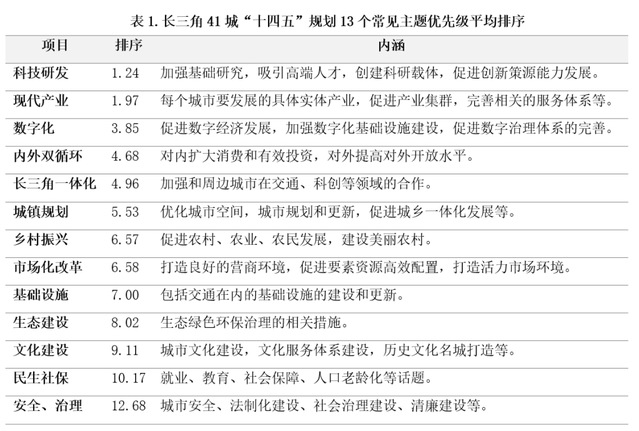 所有城市的规划内容都选自这13个主题,或有缺少,但无一逾越。这13个方面的平均优先级排序见表1:排序一列的数字越小,表示该事项在规划政策文本中的位置越靠前,受重视程度越高。