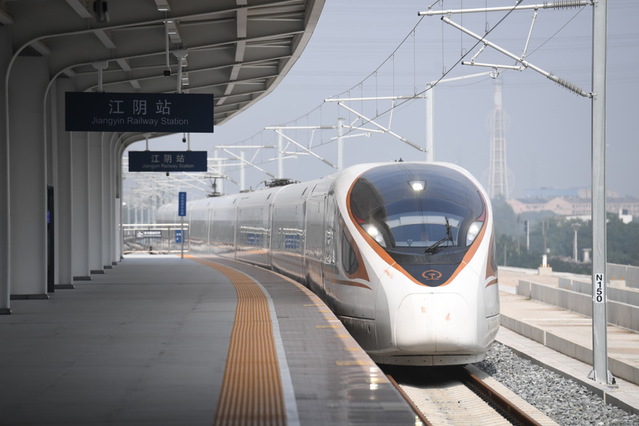 新华社照片,南京,2023年9月28日沪宁沿江高铁建成通车,一辆动车组列车驶入江阴站。 新华社记者季春鹏摄
