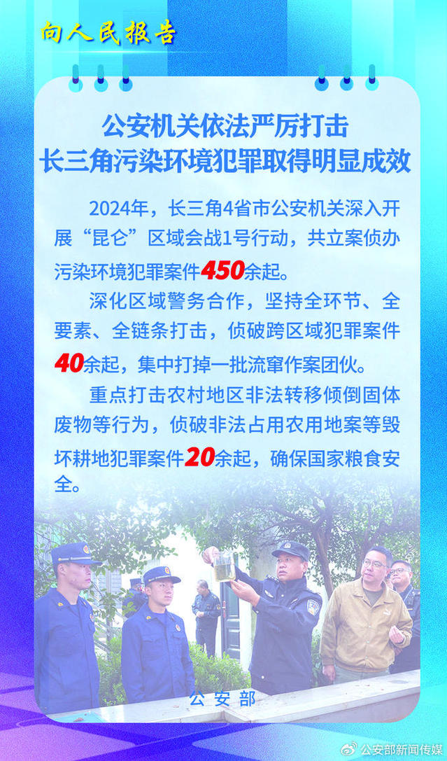 公安部有关部门负责人表示,公安机关将始终保持依法严厉打击污染环境犯罪的高压震慑态势,进一步聚焦重点行业、重点行为、重点环节等,不断创新精准打击、深度打击、规模打击、联动打击策略方法,全力打好总体仗、攻坚仗和协同仗,坚决守牢美丽中国建设安全底线,护航长三角地区高质量发展。