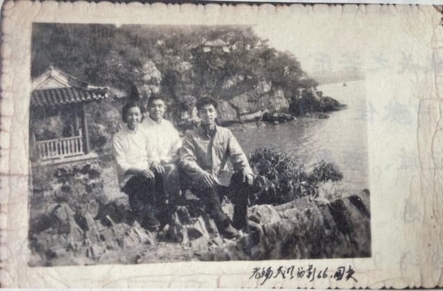 1966年,虞孝感和父母在太湖边合影。