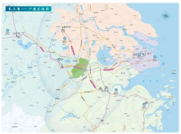 有一座城市,行政上隶属于安徽,但即将实现高铁1小时直达上海,距离南京禄口、杭州萧山和无锡硕放三大机场只有100公里,距离繁忙的宁杭高铁沿线多个站点只有40至50公里,距离烟波浩渺的太湖只有30公里,距离浙江安吉的绿水青山只有20公里……这就是安徽广德。