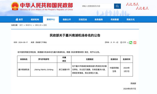 近日,民政部发布公告,经中国民用航空局批准,新建嘉兴机场命名为嘉兴南湖机场。