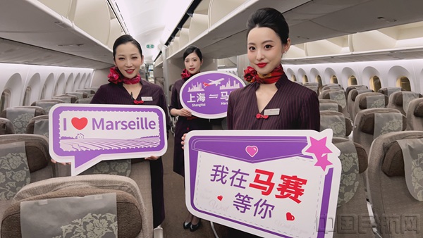 上海航空的“上海—马赛”首航乘务组迎接旅客登机(东航供图)