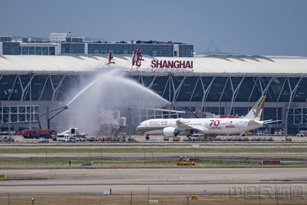 水门仪式迎接巴林—上海首航航班(徐炳南/摄)