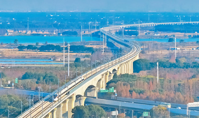 试运行列车驶过沪苏湖高铁青浦特大桥金泽桥段。张海峰摄(人民视觉)