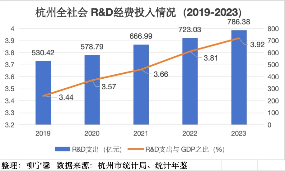2023年,杭州R&D投入规模达到786.38亿元,仍低于北京(2947.1亿元)、深圳(2236.6亿元)、苏州(1055亿元)、广州(1042.99亿元)、成都(824.12亿元)等城市。
