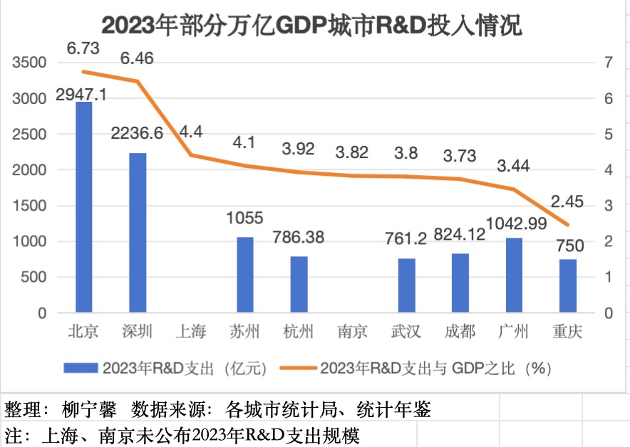 21世纪经济报道梳理发现,根据已公布的最新数据,2023年我国GDP排名前十的城市中,北京、深圳研发投入强度遥遥领先,均超过6%,上海、苏州也超过4%,随后是杭州、南京、武汉、成都、广州均超过3%,重庆为2.45%。